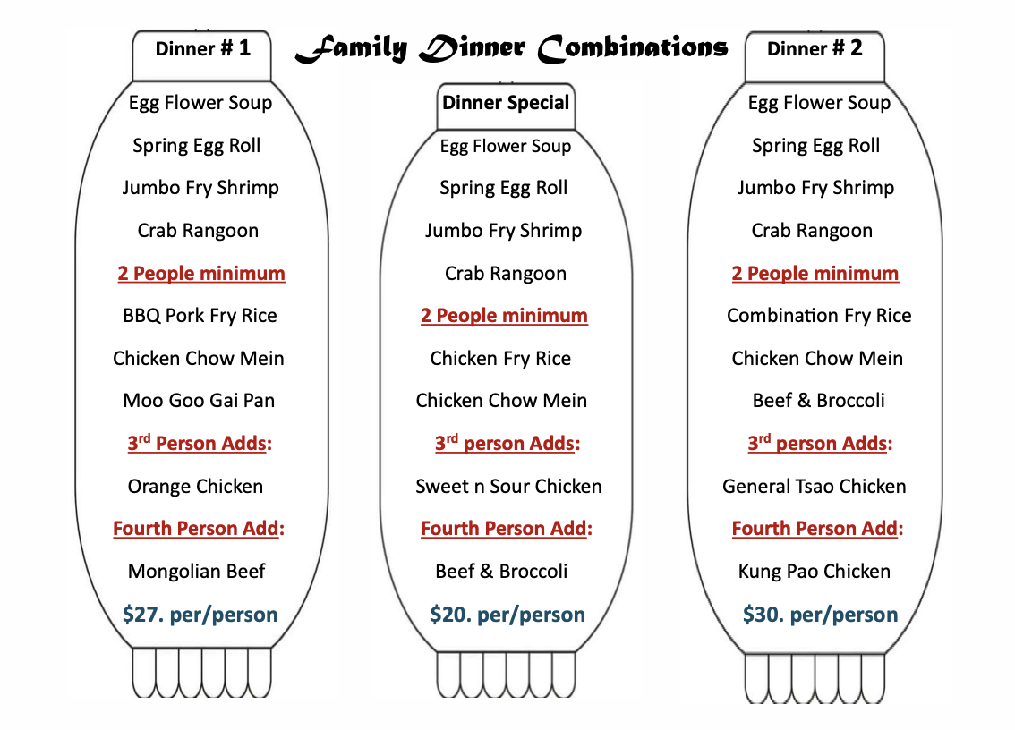 To make the best family combination meal, we have the; Family Dinner Combo #3. For this third combination which currently retails for $30. Per person, as of April 2026, with a minimum order of 2 two diners, receive all the appetizers and soup as with the first and second Combination, which includes: Egg drop soup, Spring Egg Roll, Fry Shrimps served with homemade sweet n sour sauce, and Chinese Hot-Mustard, all this is followed by Chicken Chow Mein, Combination Fried Rice, and Beef Broccoli Certified Angus.