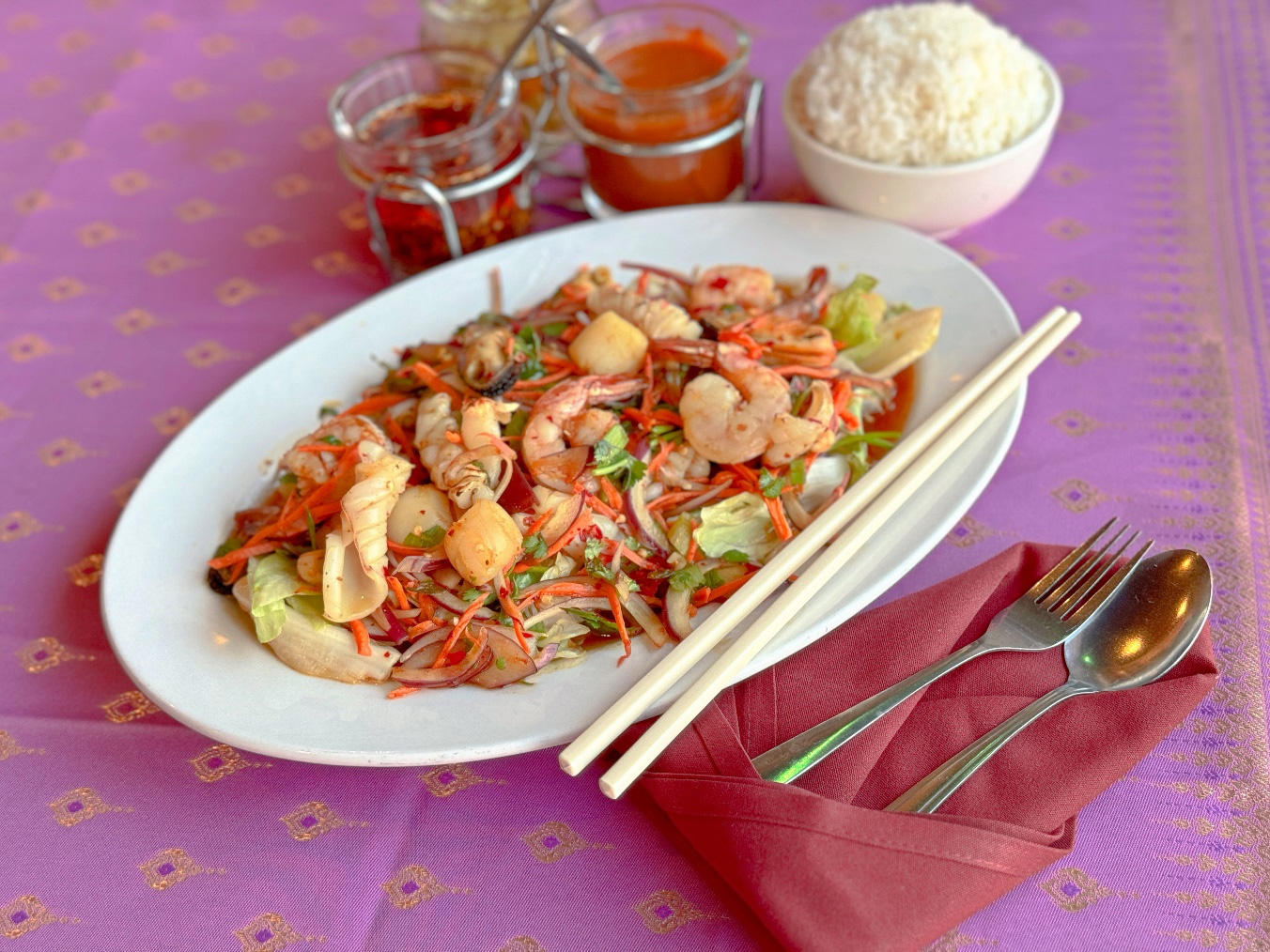 July 19, 2024 LAS VEGAS NV - Kung Fu Thai & Chinese Restaurant, which first opened in 1973, on 3rd and Fremont Street in downtown Las Vegas, is adding the quintessential Thai Summertime Appetizer, The Spicy Seafood Salad to its Lunch and Dinner menu. Cooked with Jumbo Shrimps, Calamari, Scallops, Green shell Mussels, along with diced carrots, red onions, cilantros, all smothered on a bed of Iceberg Lettuce.