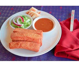 Soft Tofu (soy bean curd) Deep Fried in vegetable frying oil free of trans fat and no cholesterol, fried until crispy served along side our special Thai peanut based mildly spiced sauce and a mini cucumber salad.